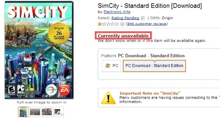 A loja online Amazon interrompeu a venda da versão digital de "SimCity", devido aos inúmeros problemas de conexão enfrentados pelos consumidores.